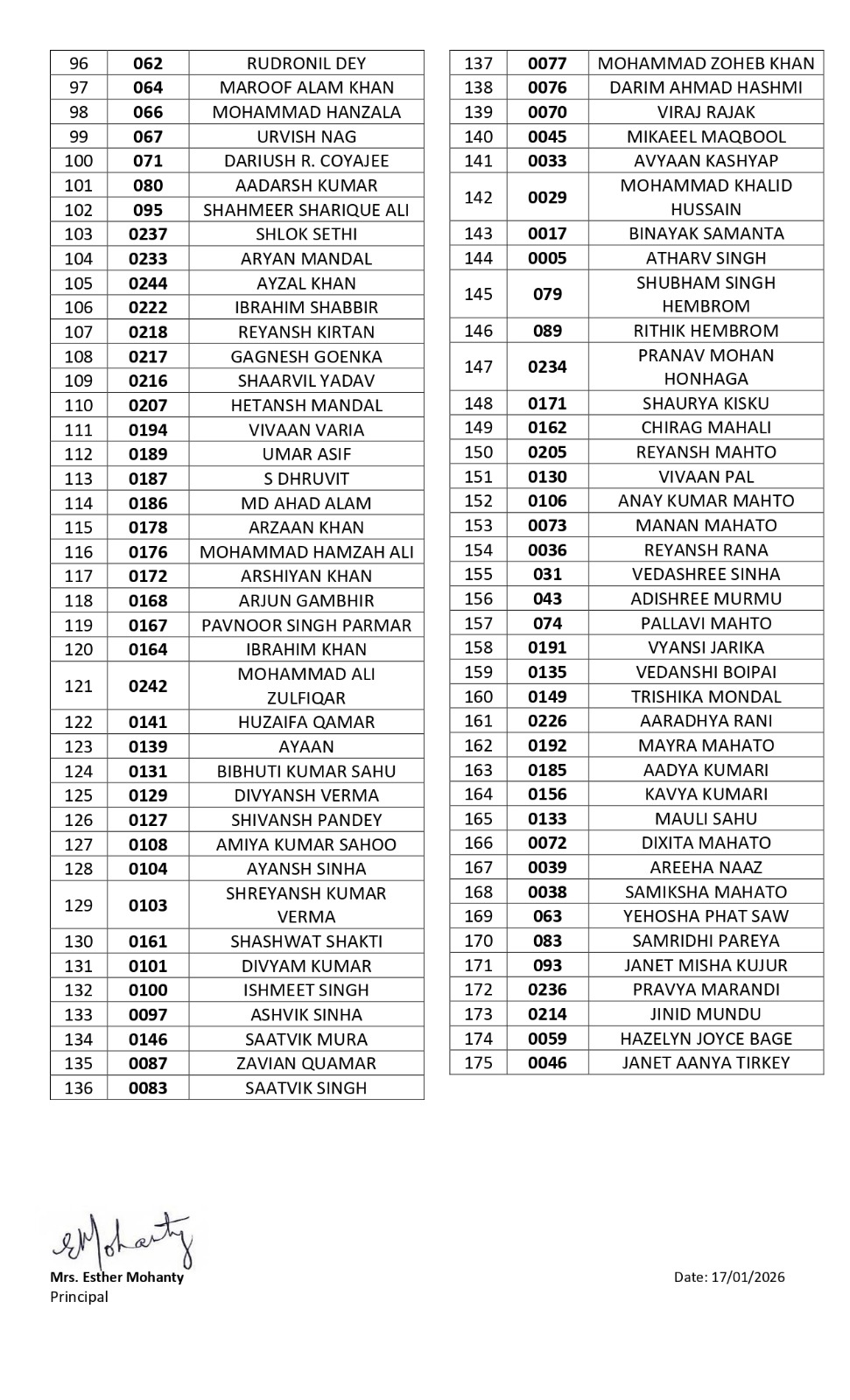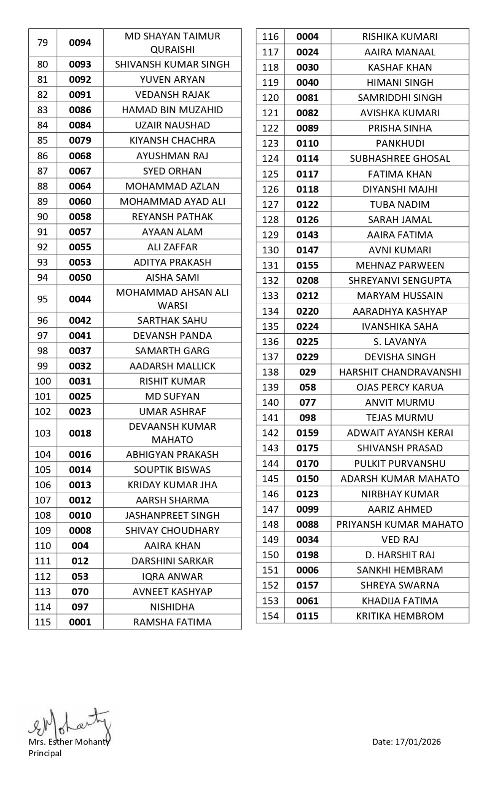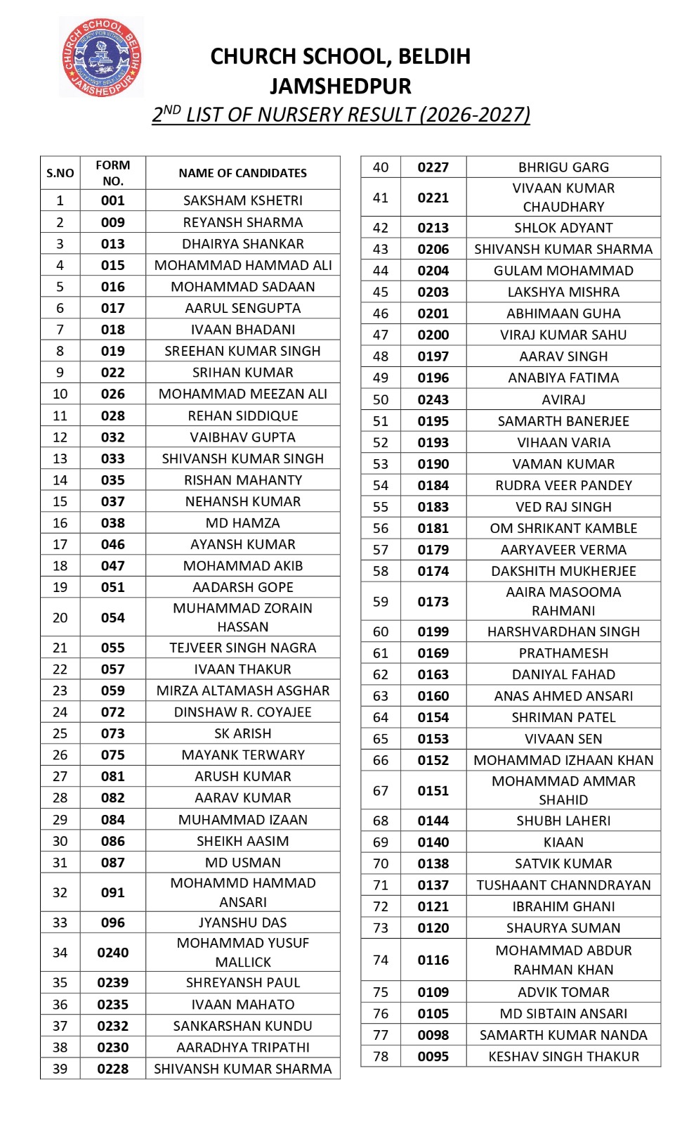 Nursery Admission List for session 2026-2027